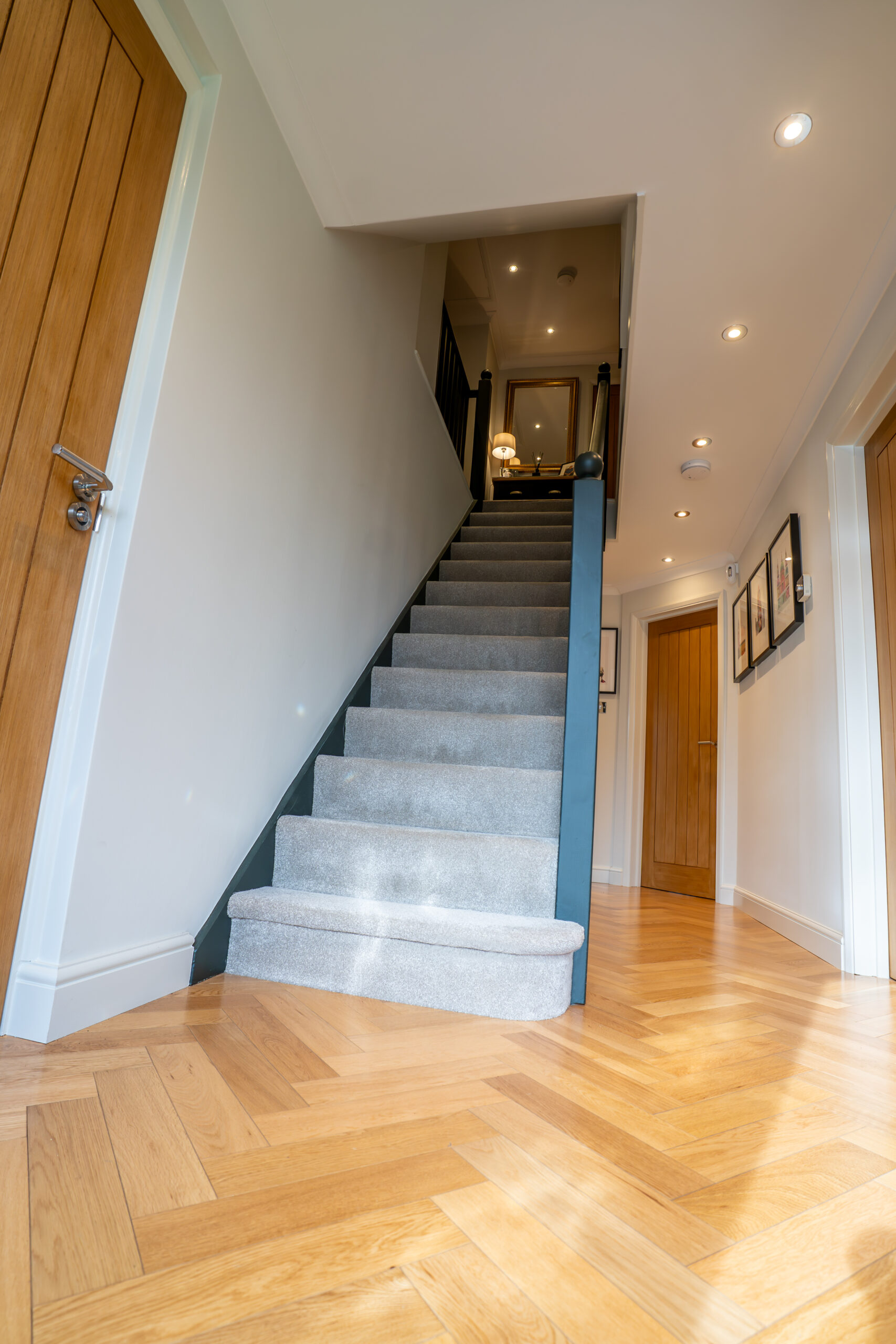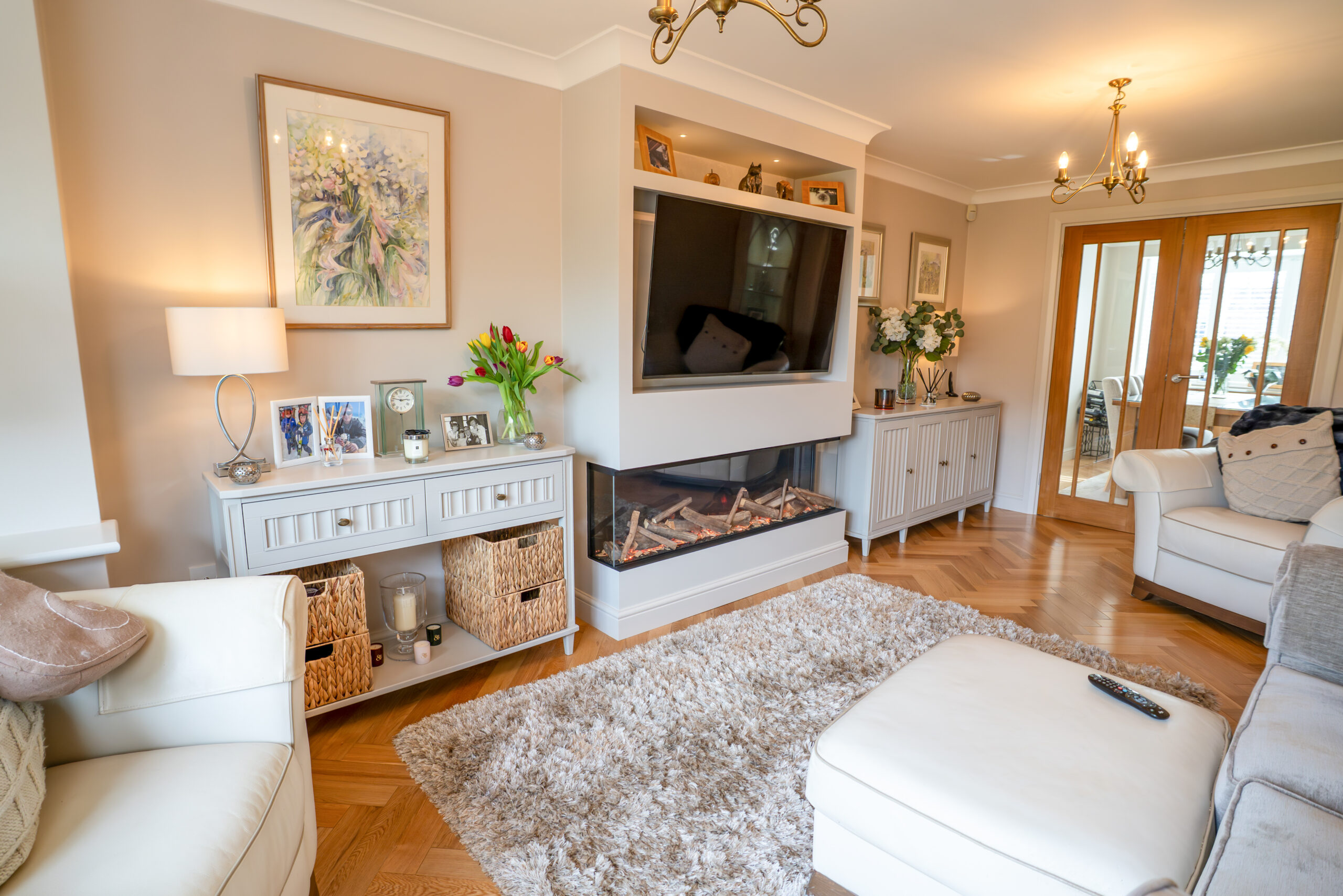 A bespoke media wall was installed in the lounge as the main focal point, featuring a contemporary fireplace that creates a stylish centerpiece. Across the ground floor, high-quality engineered wood flooring was fitted in a herringbone pattern, adding warmth and a timeless finish.